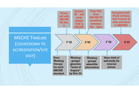 The Middle States Commission on Higher Education (MSCHE) is the college’s current accreditor. The college was last accredited in 2019; the college is currently preparing for re-accreditation, with a site visit occurring in either Fall 2027 or Spring 2028. Below is a chart that provides an overview of the college’s current timeline.