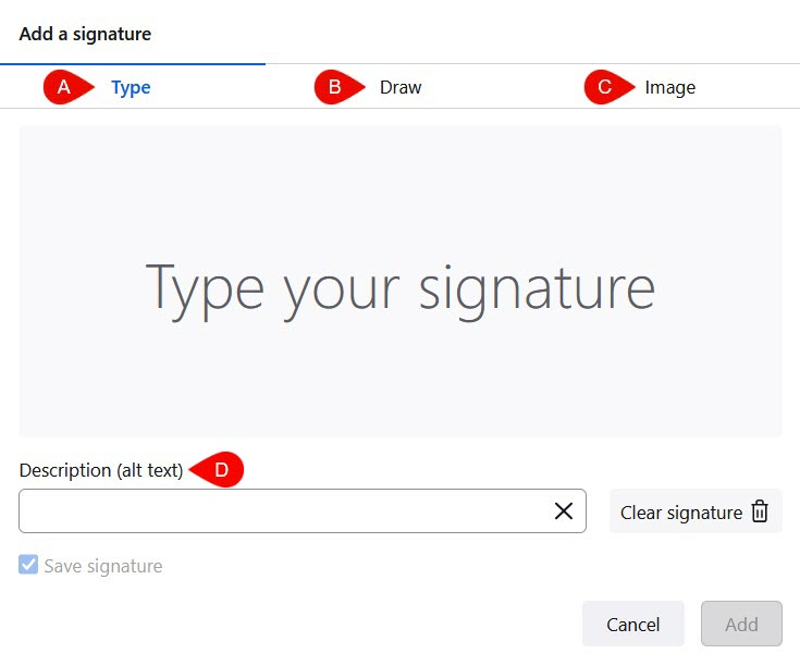 Firefox has the most fully-featured built-in PDF signature tool of any browser. Open any PDF in Firefox and click the Add Signature button in the top toolbar. You can: